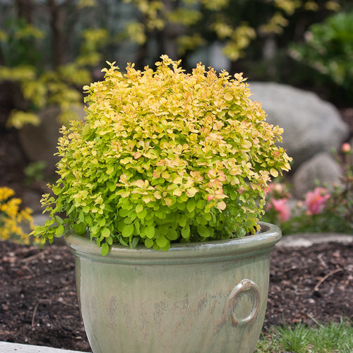 Ein dorniger Zierstrauch mit leuchtend gelben Blättern, der langsamer wächst und etwa 30-40 cm hoch wird. Er ist pflegeleicht und schnittverträglich und eignet sich gut für Beete und Steingärten.