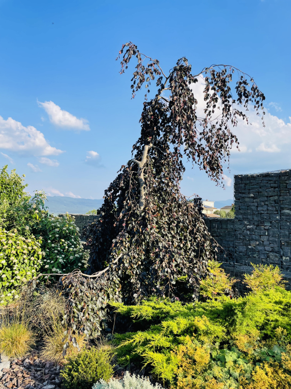 Die Purple Fountain Buche eignet sich aufgrund ihres schmalen Wuchses, der aus einem aufrechten Stamm und überhängenden Ästen besteht, hervorragend für kleine Gärten. Ihre glänzenden Blätter haben eine satte, intensiv violette Farbe und hängen an den überhängenden Ästen dieses edlen Baumes herab. Purple Fountain braucht einen sonnigen Standort, um die schönste Farbe zu erhalten. Diese Sorte wird maximal 5-6 m hoch und eignet sich durch ihr langsames Wachstum und ihren säulenförmigen Wuchs auch für kleinere Gärten.