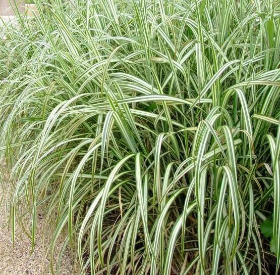 Miscanthus sinensis Cabaret - Dies ist eine der dominanten und hohen Zierpflanzen, die einen perfekten Solitär oder Hintergrund für ein gemischtes Beet bildet. Die Blätter zeichnen sich durch einen gelben Mittelstreifen aus. Sie wächst kräftig und bildet dichte Büschel, die bis zu 2,5 m hoch werden können. Junge Exemplare benötigen einen Winterschutz.