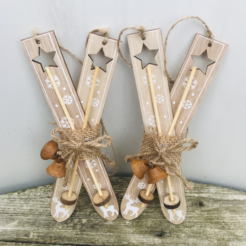 Einfach, aber mit einem besonderen Charme. Sie müssen die Skier nicht dekorieren, hängen Sie sie einfach an die Tür, stecken Sie sie an einen Kranz oder schmücken Sie den Weihnachtsbaum.