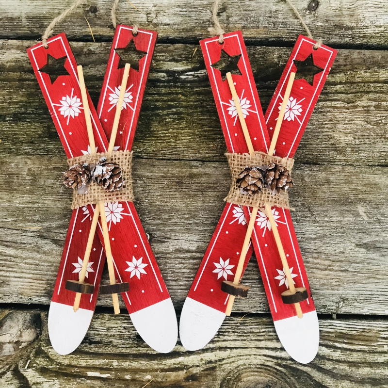 Einfach, aber mit einem besonderen Charme. Sie müssen die Skier nicht schmücken, sondern können sie einfach an die Tür hängen, an einen Kranz hängen oder den Weihnachtsbaum schmücken.