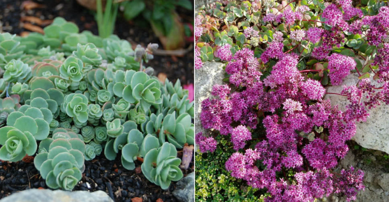 Die rundlichen Blätter der Mongolei sind im Spätsommer vollständig mit blassrosa halbkreisförmigen Blüten bedeckt. Eine schöne Pflanze für Beeteinfassungen. Diese Art ist nicht immergrün, aber sie zieht sich für den Winter zurück, so dass die neuen blaugrauen Blätter im Frühjahr sehr frisch aussehen.