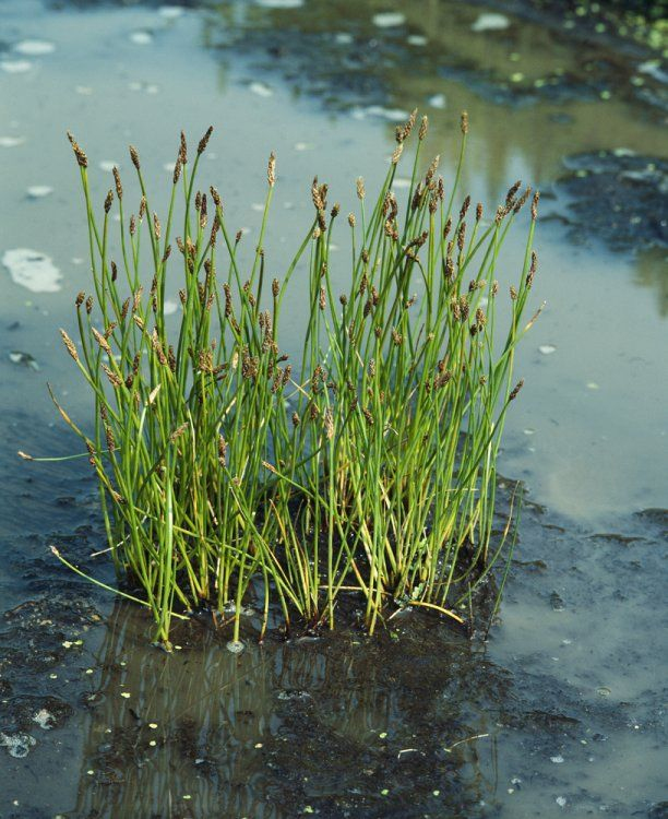 Eleocharis palustris, das Schlammkraut, ist eine mehrjährige Pflanze, die in Europa, Nordafrika und Asien vorkommt. Hierzulande ist sie im ganzen Land vom Tiefland bis ins Gebirge an gelegentlich überschwemmten Stellen wie Feuchtwiesen usw. zu finden. Es gehört zur Familie der Cyperaceae. Das Schlammkraut ist ein mehrjähriges Kraut mit einem langen, kriechenden Rhizom, aus dem steife, blattlose Zwiebeln wachsen, die bis zu 80 cm hoch werden. Es blüht von Mai bis August mit Blüten in Form einer apikalen Traube. Der Kelch ist bis zu 2 cm lang, länglich und an der Spitze spitz zulaufend und besteht aus einer großen Anzahl von Blüten. Die Pflanze ist für feuchte Standorte, Teichufer und Teiche geeignet. Sie stärkt die Ufer und wird von Fischern als nützlich angesehen, da sie geeignete Laichplätze für Fische bietet.