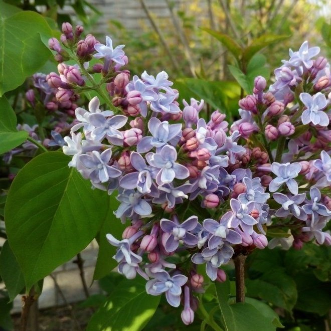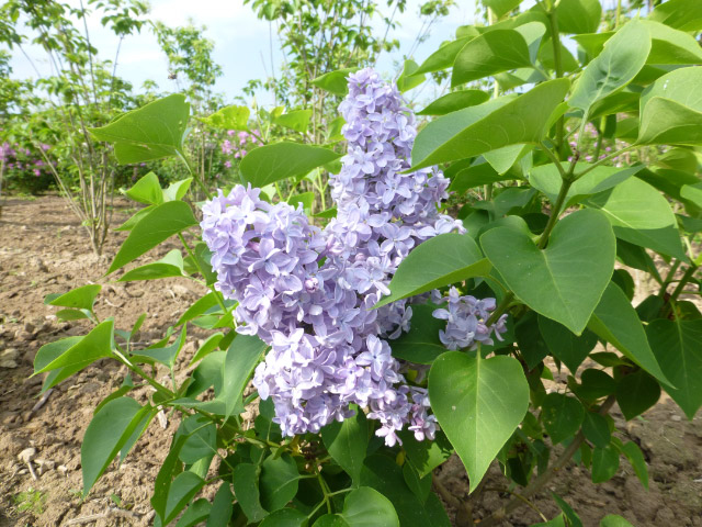 Flieder Carpe Diem - eine Sorte mit sehr dichten, kegelförmigen Blütenständen. Die Einzelblüten sind gefüllt, rosa-violett gefärbt und duften süß. Er blüht von Mai bis Juni. Die Blätter des Strauches sind herzförmig, recht groß - bis zu 10 cm lang - und glänzend