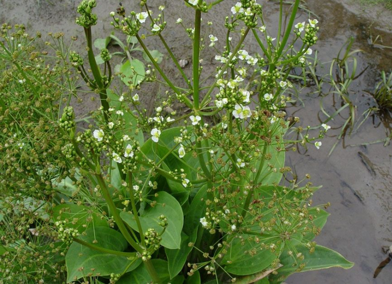 Der Wegerich ist an seiner breiten Rosette aus löffelförmigen Blättern zu erkennen. Er hat spärliche Blütenstände hoch über den Blättern. Die Blüten sind hellrosa bis weiß gefärbt. Der Wegerich blüht im Juli bis August und die Pflanze kann bis zu einem Meter hoch werden. Er eignet sich für flache und sumpfige Zonen mit einer Tiefe von 5 - 30 cm.
