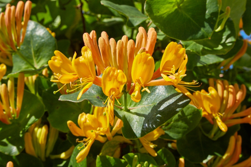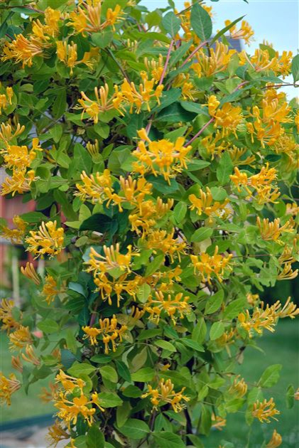 Kultivar, gezüchtet in Budapest, Ungarn um 1920 durch Kreuzung von L. sempervirens und L. tragophylla. Ein kletternder, üppiger, sommergrüner Strauch, der eine Höhe von 3,5-6 m erreicht. Die Blätter sind 5-10 cm groß, auf der Oberseite tiefgrün, auf der Unterseite weißlich-silbrig. Die Blüten blühen im Juli-August in orange-gelb. Die Beeren sind leuchtend rot, rund. Wächst in jedem Gartenboden, solange er nicht zu trocken ist. Wächst sowohl in der Sonne als auch im Halbschatten gut. Winterhart bei -18°C bis -22°C. Dankbar für Winterschutz, besonders bei jungen Pflanzen. Sehr eindrucksvoll an Zäunen. Etwas höher als andere Bodendecker, so dass sie auf größeren Pergolen und Stützmauern gut zur Geltung kommt