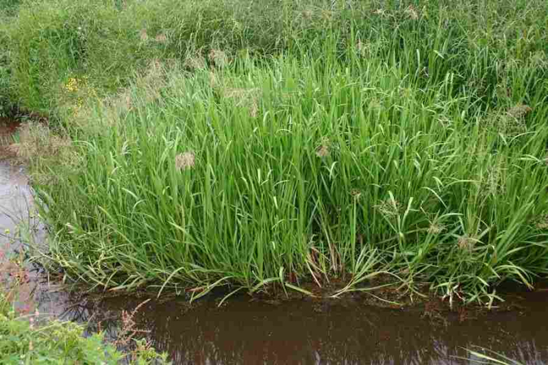 Ein Gras, das sich für den Anbau an den Ufern von Gewässern eignet. Es wird etwa 80 cm hoch und bildet kriechende Langtriebe. Die Blätter sind grün gefärbt. Das Blatt ist oben glatt und unten rau. Sie blüht in gelb-grünen Rispen, die 20-40 cm lang sind. Sie sind eine schöne Ergänzung für Teichufer.