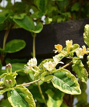 Lonicera japonica Kogel-mogel ist der lateinische Name eines niedrigen Strauches. Bei uns ist er als Japanischer Kogel-mogel bekannt. Er wird der Familie der Caprifoliaceae zugeordnet. Diese schöne Sorte, die bis zu 4 m hoch wird, hat einen jährlichen Zuwachs von 0,5 bis 1 m. Sie bildet zierliche, kleine, elliptische, unregelmäßig gelappte und grünlich-gelbe Blätter. Sie blüht von Juni bis Juli mit kleinen, duftenden, cremefarbenen, später orangefarbenen Blüten. Die Knospen sind dunkelrosa, im entfalteten Zustand cremerosa. Sie verblassen allmählich zu gelb-orange. Die Blüten werden durch kleine, schwarz-violette Beeren ersetzt, die Ende September, Anfang Oktober erscheinen. Sie braucht eine Stütze zum Wachsen.