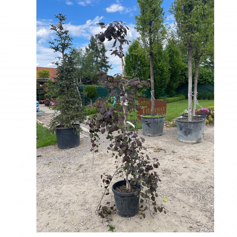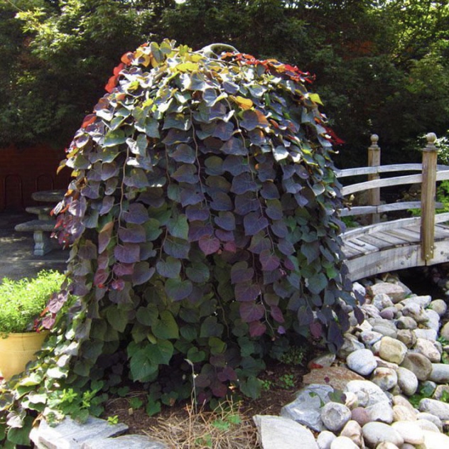 Ruby Falls ist eine überhängende Sorte mit prächtigen, tiefrosa Blüten im Frühjahr und später violetten Blättern. Die Laubfärbung wechselt im Herbst zu leuchtenden Orange-, Gelb- und Rottönen. Die Wuchshöhe der Sorte wird durch das Entfernen von Blütenblättern selbst bestimmt.