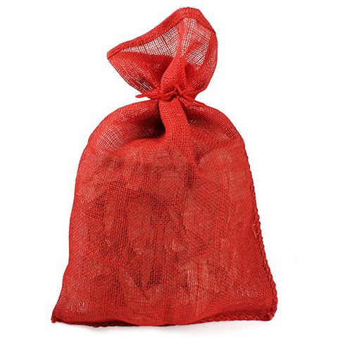 Der rote Jute-Geschenksack wird einfach mit einem Kordelzug verschlossen.