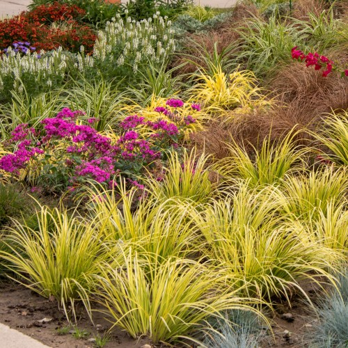‚Golden Delight‘ ist eine besonders attraktive, immergrüne Sorte mit hohem Zierwert. Die schmalen, hellgrünen Blätter sind mit einem markanten gelben Streifen versehen und bilden dichte, elegant gefächerte Büschel. Im Mai schmückt sich die Pflanze mit grünlich-gelben, ährenförmigen Blüten. Ideal als Strukturpflanze im Beet, für Steingärten oder als Blickfang im Kübel.