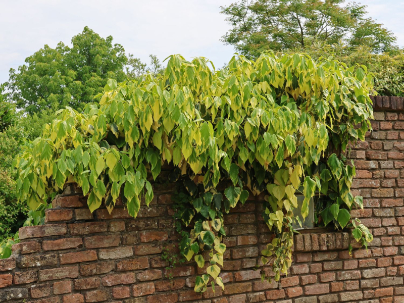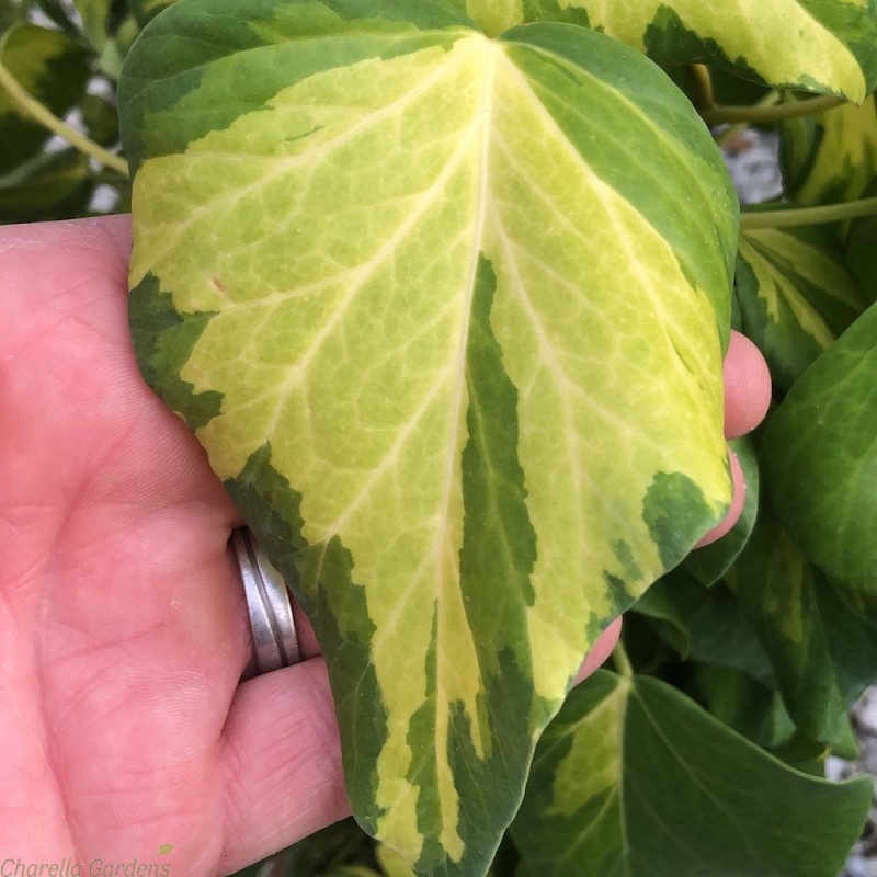 Sulphur Heart ist eine seltene und schöne, großblättrige Form des Kaukasischen Efeus. Die Blätter können so groß wie die Handfläche eines erwachsenen Mannes sein, sind herzförmig, leicht glänzend, ledrig, immergrün, hellgrün mit einer satten, goldgelben Verfärbung und einem Rand, einige sind jedoch nur dunkelgrün. Diese immergrüne Kletterpflanze eignet sich hervorragend als Ergänzung zu immergrünen Arrangements. Sie kann auf beiden Seiten der Welt gepflanzt werden, aber im Schatten ist der Kontrast zwischen Gelb und Grün stärker ausgeprägt. In der Sonne sind die Blätter eher gelb und verfärben sich im Winter in ein helles Burgunderrot bis Braun. Sie wächst recht schnell und zuverlässig.