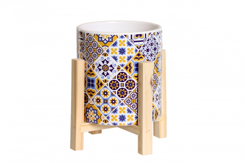 Keramischer Pflanztopf im Holzständer Mosaik
