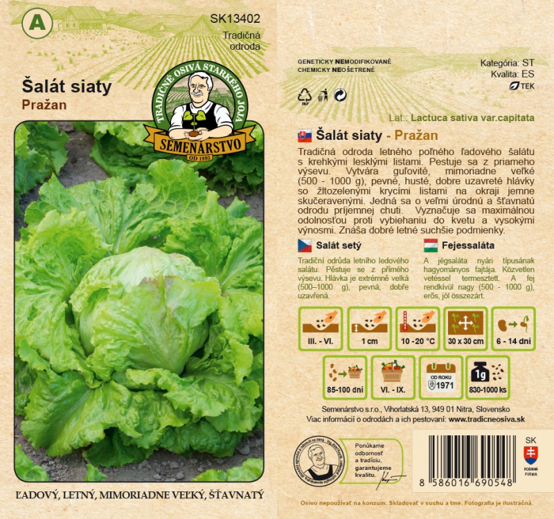 Traditionelle Sorte des Sommerfeld-Eisbergsalats mit knackigen, glänzenden Blättern. Er wird aus Direktsaat angebaut. Er bildet kugelförmige, sehr große (500-1000 g), feste, dichte, gut geschlossene Köpfe mit gelbgrünen, am Rand leicht gewellten Deckblättern. Es handelt sich um eine sehr ertragreiche und saftige Sorte mit einem angenehmen Geschmack. Sie zeichnet sich durch eine hohe Widerstandsfähigkeit gegen das Ausblühen der Blüten und hohe Erträge aus. Sie verträgt gut sommerliche, trockene Bedingungen.