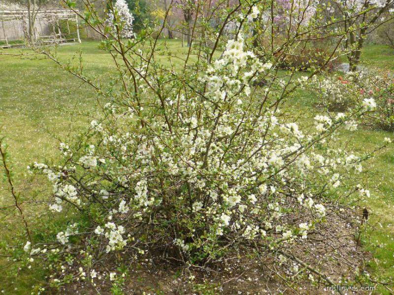 Kinshiden ist eine einzigartige Zwergsorte mit großen, halbgefüllten Blüten in zartem Grüngelb. Sie öffnen sich im zeitigen Frühjahr, wenn das Wetter wärmer wird, in der Regel ab Mitte April, aber bei einem warmen Spätwinter können sich die Knospen auch schon im März öffnen. Die Blütezeit dauert recht lange, und die Sträucher stehen noch im Mai in voller Blüte. Nach der Blüte bilden sich die niedlichen, unförmigen, aber sehr aromatischen, grünlich-gelben Früchte, eher am älteren Holz im Inneren des Strauches. Sie reifen im Oktober.