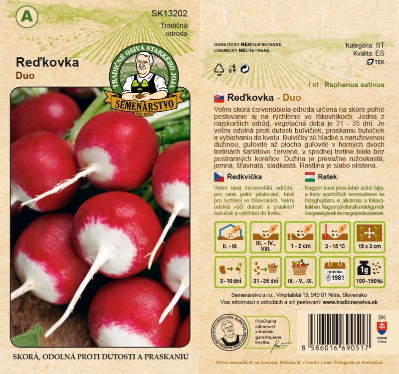 Eine sehr frühe rot-weiße Sorte für den frühen Feldanbau und für die Befruchtung im Gewächshaus. Eine der frühesten Sorten mit einer Wachstumszeit von 31-35 Tagen. Sie ist sehr widerstandsfähig gegen das Aushöhlen der Knollen, das Aufplatzen der Knollen und das Schossen. Die Knollen sind glatt mit rosafarbenem Fleisch, kugelförmig bis flachkugelförmig in den oberen zwei Dritteln, scharlachrot, weiß im unteren Drittel, ohne Seitenwurzeln. Das Fruchtfleisch ist überwiegend rosafarben, zart, saftig, süßlich. Die Pflanze ist schwach laubabwerfend