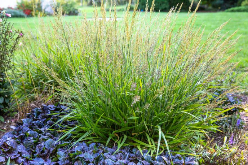 Diese kürzere Hybride, die ein wenig wie ein Zwerg Karl Foerster aussieht, bildet einen dichten Hügel aus grünem Laub, der später in der Saison von vielen goldbraunen Blütenständen gekrönt wird.