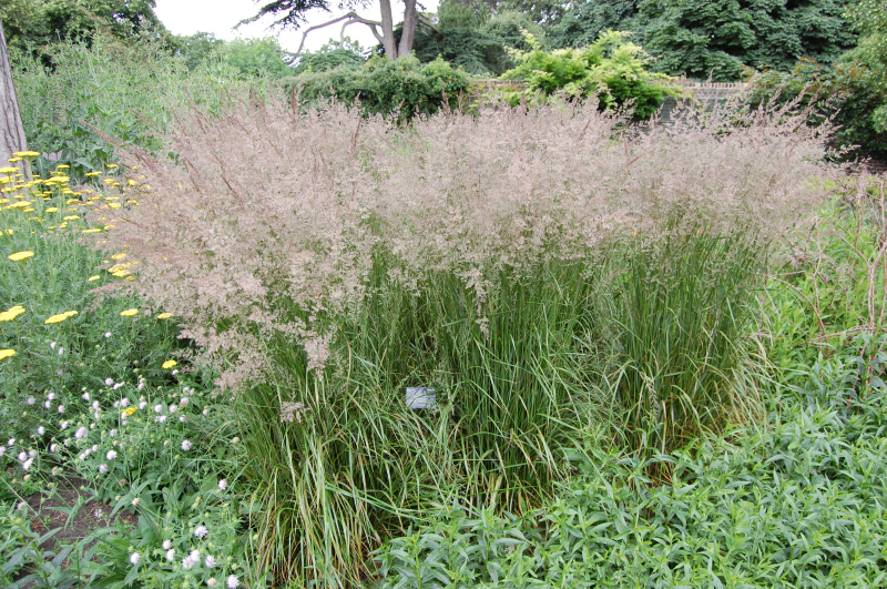 Reitgras ist ein anspruchsloses hohes Gras mit kräftigem und aufrechtem Wuchs, das in den Sommermonaten mit gelb-braunen Ähren blüht.