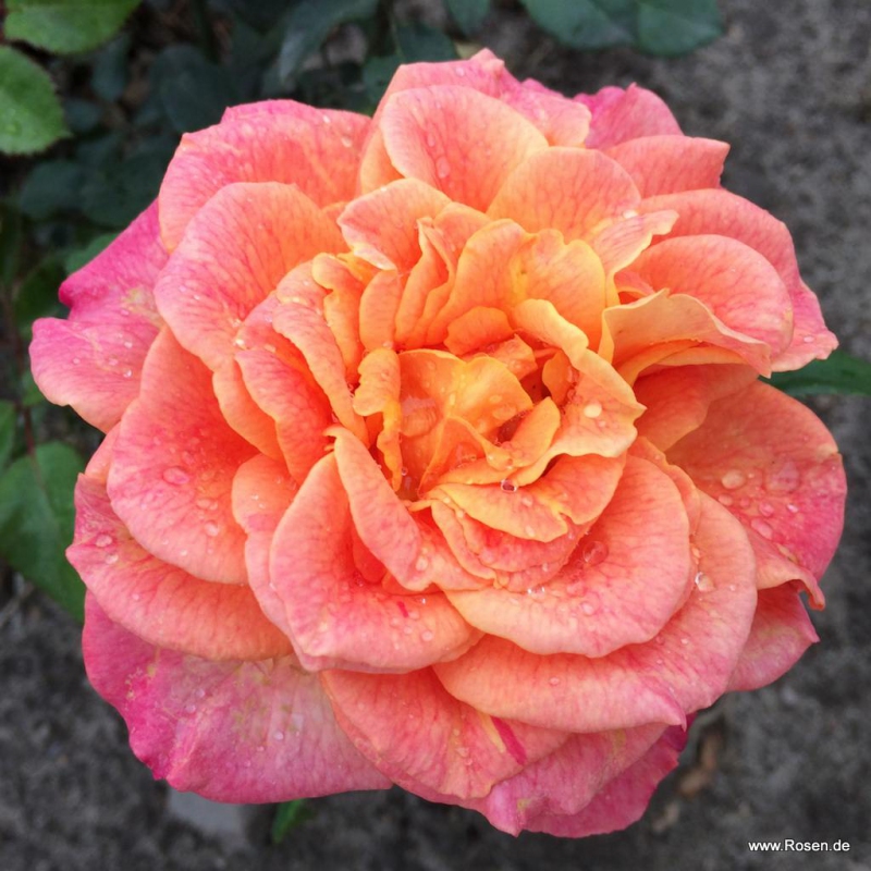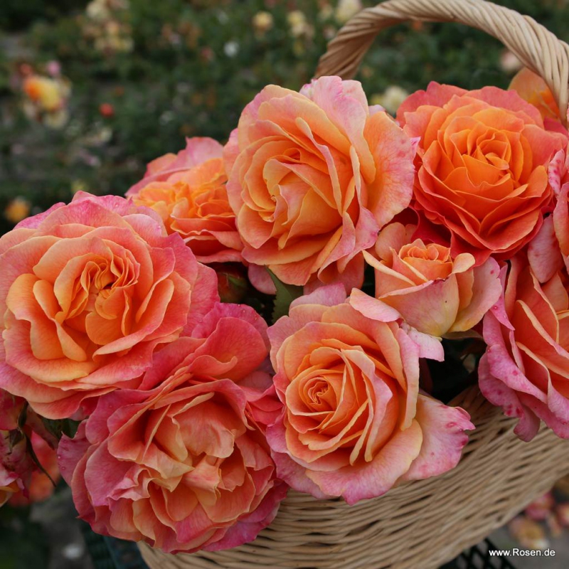 Kräftiger, aufrecht wachsender Hybridstrauch mit elegant geformten Blüten in kleinen Trauben und gesundem Laub. Die großen, stark gefüllten Blüten zeigen ein lebhaftes Farbenspiel zwischen zartem Gelb, leuchtendem Orange und Rosa.