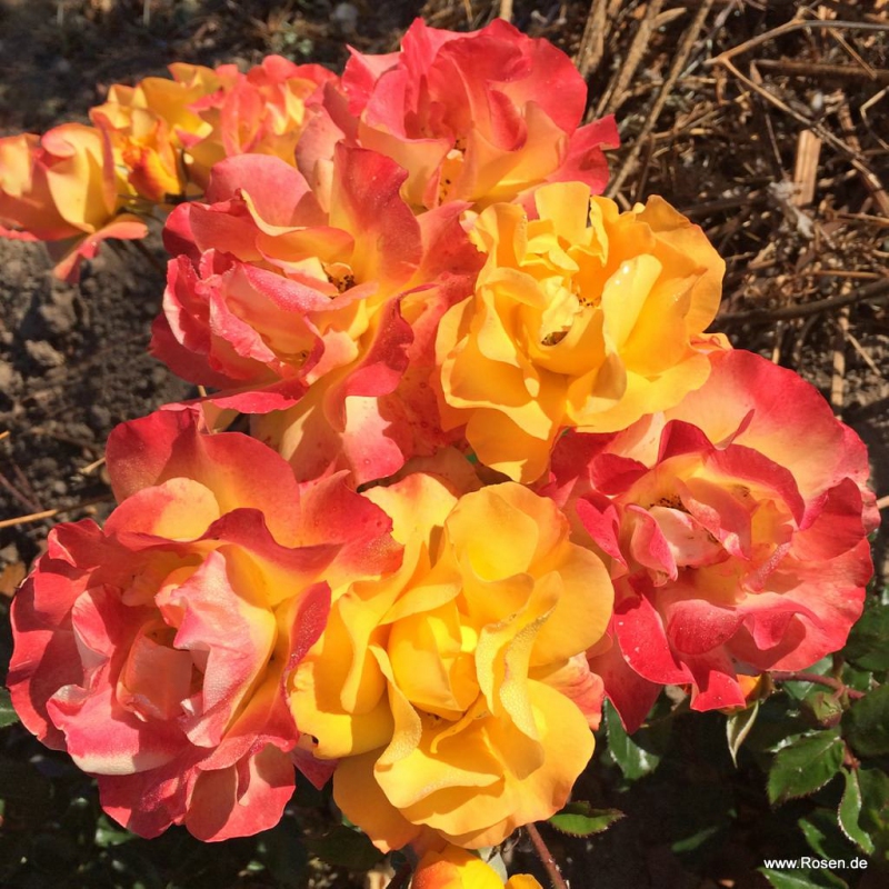 Die Rose Kordes Bright Smiles wurde 2021 von Kordes gezüchtet. Die robuste, aufrecht wachsende Rose besticht durch die Farbe ihrer halbgefüllten Blüten. Das Gelb mit roter Umrandung ergänzt sich wunderbar mit dem dunkelgrünen Laub, das sich durch seine Gesundheit auszeichnet. Die Pflanze erreicht eine Höhe von 70 cm und eine Breite von 50 cm. Neben dem Beet eignet sie sich auch für den Anbau in Töpfen.