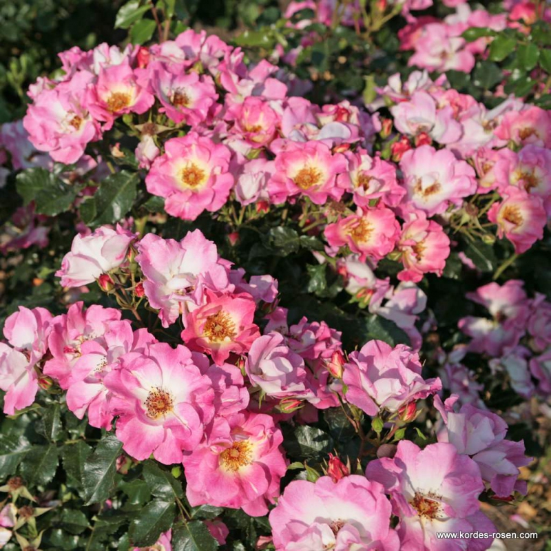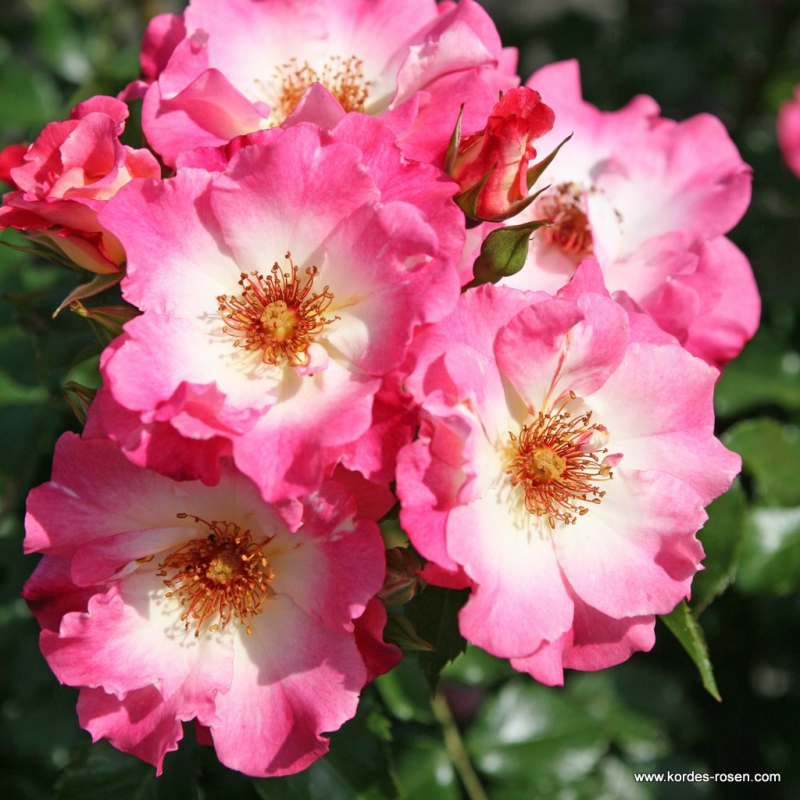 Diese neue mehrblütige Rose besticht durch die Größe der Blüten, die einfach, aber wunderschön gefärbt sind, von Weiß bis zu Rosatönen an den Rändern der großen Blüte. Die Zentren sind orange-rot und verschmelzen wunderschön mit dem Rosa der Blütenblätter.