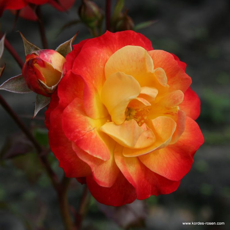 Firebird ist eine prächtige, mehrblütige Rose in einer Kombination aus leuchtendem Rot und Orange, die buchstäblich den Eindruck eines lodernden Feuers vermittelt. Die Firebird-Rose von Kordes blüht wiederholt als aufrechter Strauch, der eine Höhe von 70 cm und eine Breite von 50 cm erreicht. Ausgezeichnete Krankheitsresistenz.