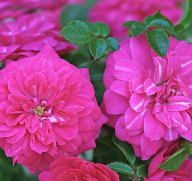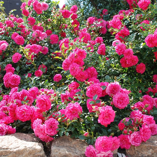 Breit wachsende rosa Rose mit gefüllten Blüten. Sie ist für Kübel geeignet. Bodendeckerrosen werden gepflegt, indem man die vertrockneten Blütenstände und den Teil des Stiels, der den Blütenstand trägt, immer wieder abschneidet. Bodendeckerrosen mit niedrigem Wuchs und kräftigem Wachstum in die Breite. Sie bilden einen niedrigen und reichlich blühenden Unterwuchs. In Beeten wirken sie als farbenfroher Blütenteppich.