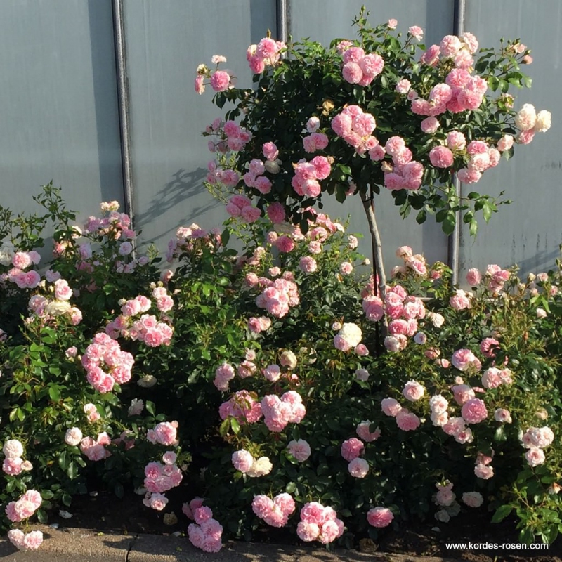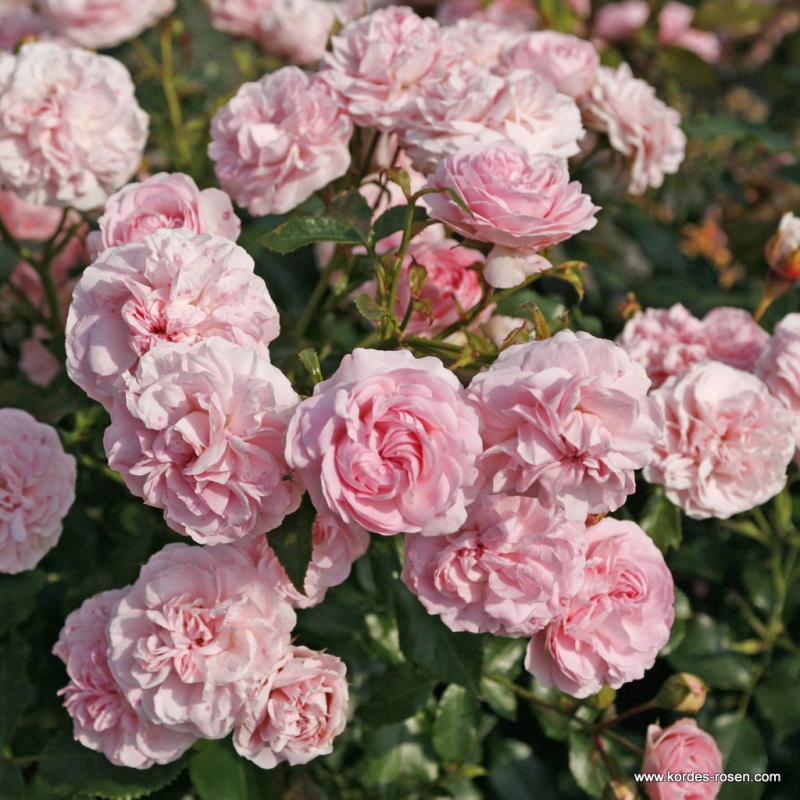 Die bodendeckende Sorte Larissa hat zarte Blüten in zartem Rosa, die sich zu reichen Blütenkugeln entwickeln, die in ihrer Form an Pfingstrosen erinnern. Eine üppig blühende, mehrblütige Rose mit sehr gefüllten, romantischen Blüten, die während der Blütezeit leicht zu reinigen sind. Sie gewann die Goldmedaille in Kortrijk 07.