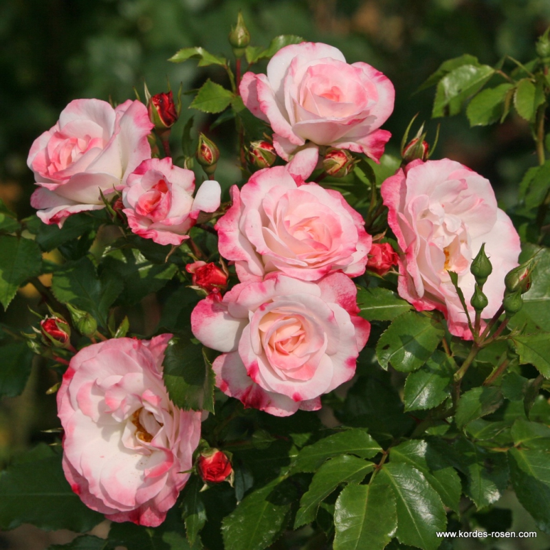 Die edle Form der Knospen, der zarte Duft und die ungewöhnliche Kombination von zwei Farben - weiß und rot. Blüht allmählich in rosa Tönen auf.