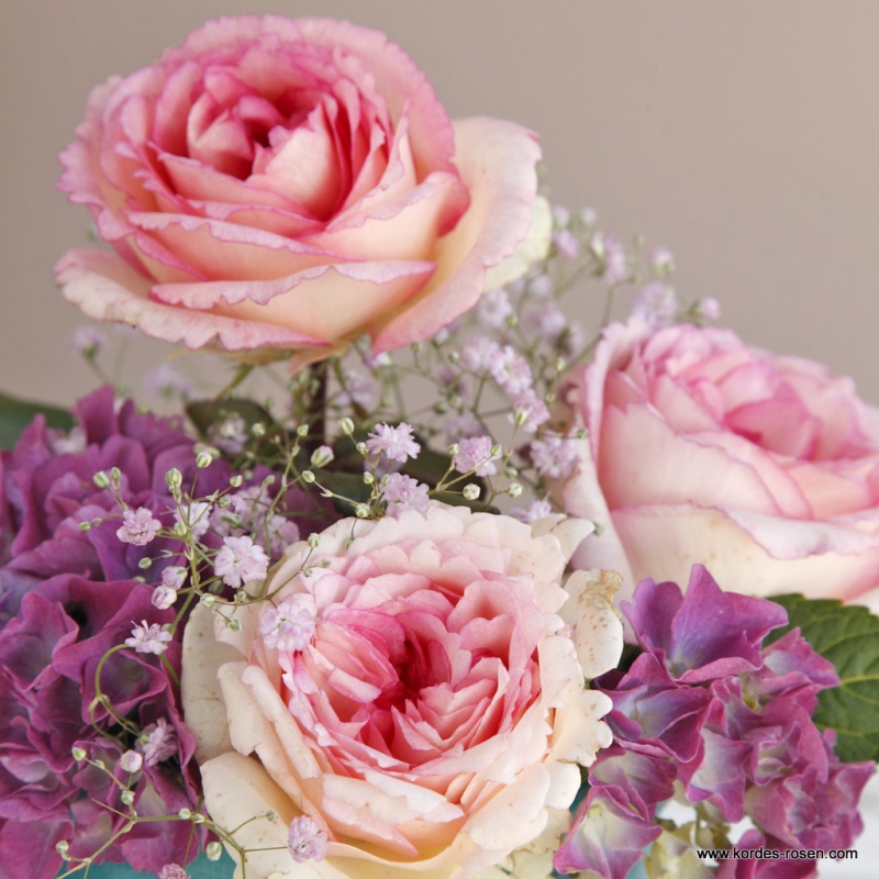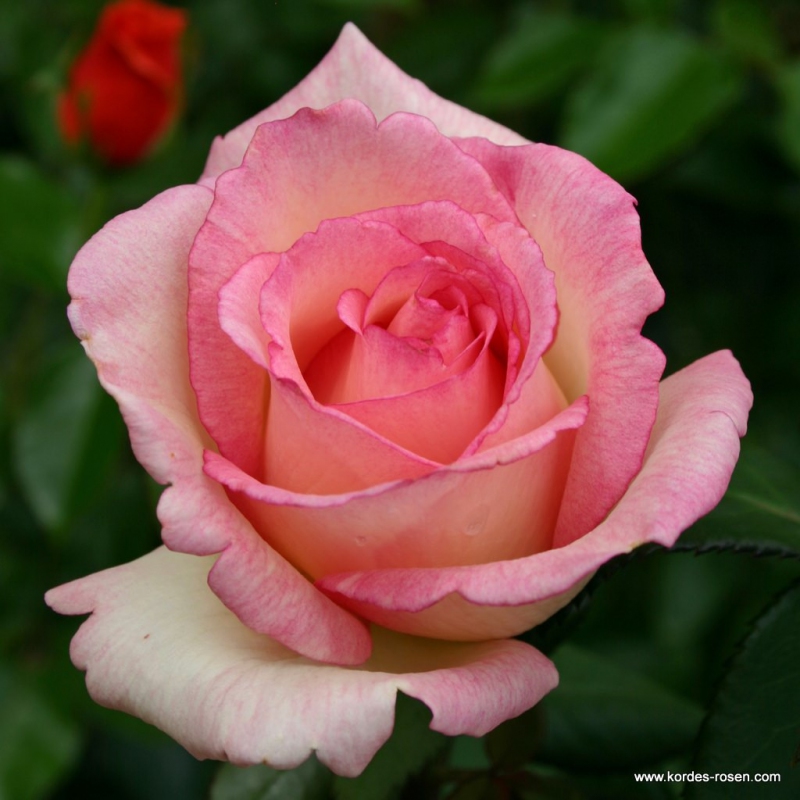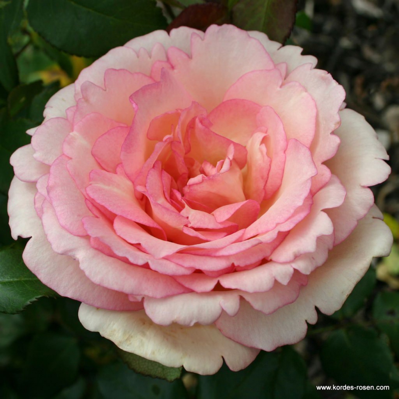 Romantische Teerose mit Spitzenblüten in cremefarbenen Pastelltönen mit einem rosa Blütenrand. Schöner süßlicher Duft.