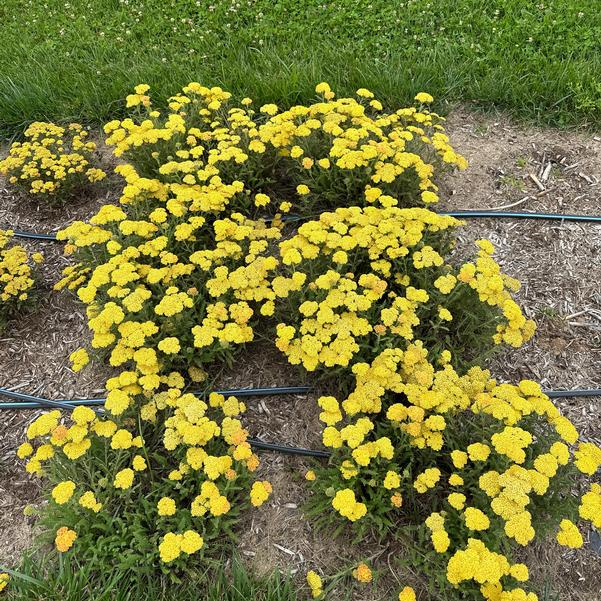 Staude mit leuchtend gelben Blüten, die den ganzen Sommer über auf aufrechten Stielen strahlen, meist von Juni bis August. Die Blütenstände bestehen aus kleinen Blüten, die in flachen Dolden angeordnet sind und sich über den fein geteilten, grau-grünen Blättern erheben. Die Pflanze erreicht eine Höhe von 70–90 cm, was sie zu einem auffälligen Element in jedem Beet macht.