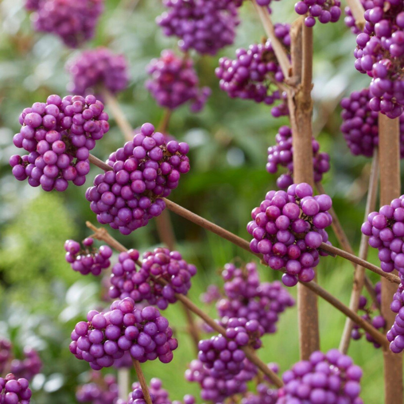 Die Bodiniera ist ein sommergrüner Strauch, der vor allem für seine atemberaubenden violetten Beeren bekannt ist, die im Herbst und Winter die Zweige schmücken. Dieser Strauch wird etwa 1,5 bis 3 Meter hoch und ist durch seine natürliche Ausbreitung ein außergewöhnlicher Blickfang in jedem Garten. Die Blätter sind schmal oval bis lanzettförmig und grün, verfärben sich aber im Herbst in goldene und violette Töne, was eine interessante Herbstfärbung ergibt. Die Blüten sind klein, rosa-violett und blühen den ganzen Sommer über, meist im Juni-Juli. Nach der Blüte bilden sich an den Zweigen markante violette Beeren, die im Spätherbst reif werden. Diese Beeren sind die Hauptzierde dieses Strauches, sie bleiben auch nach dem Laubfall an der Pflanze und oft den ganzen Winter über an den Zweigen und sorgen für einen farblichen Kontrast im Garten.