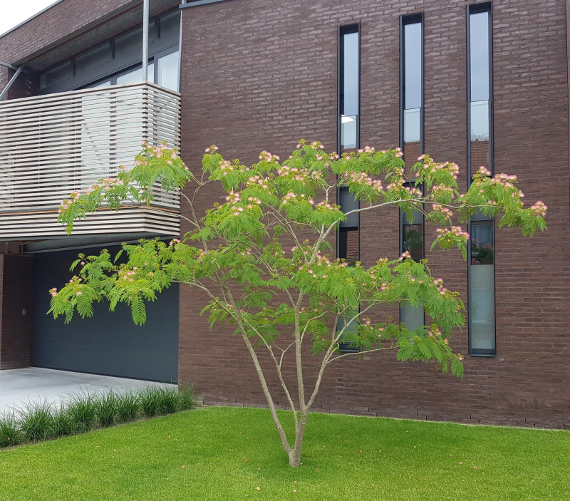 Die sehr feinen farnartigen Blätter sind die Hauptdomäne dieses regenwurmartigen Baumes. Die Blätter schließen sich bei Nacht und bei Regen. Die dunkelrosa Blüten mit langen Staubgefäßen blühen im Spätsommer. Wählen Sie einen mittelschweren Boden mit ausreichender Durchlässigkeit. Die Albizia mag sonnige, warme und geschützte Standorte. Sie darf nie längere Zeit im Wasser stehen. Im Winter muss sie gut beschattet werden.