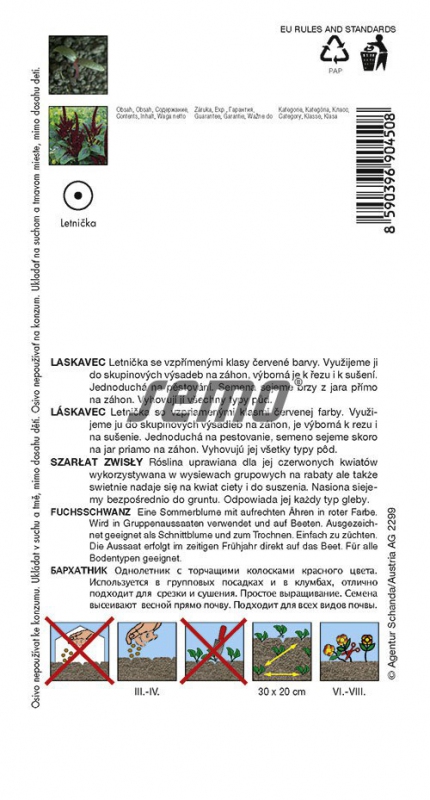 Ein schnellwüchsiger, einjähriger Strauch mit aufrechten Blütenähren von intensiv roter Farbe. Hervorragend geeignet für Mischbeete, Schnitt, Vasen und zum Trocknen. Aussaat direkt auf der Parzelle, ausnahmsweise kann man auch Setzlinge vorziehen. Der Liebstöckel ist nicht anspruchsvoll in Bezug auf den Standort, er eignet sich für feuchte, ausreichend wasserhaltende Böden und volle Sonne. Er wird 40 - 60 cm hoch.