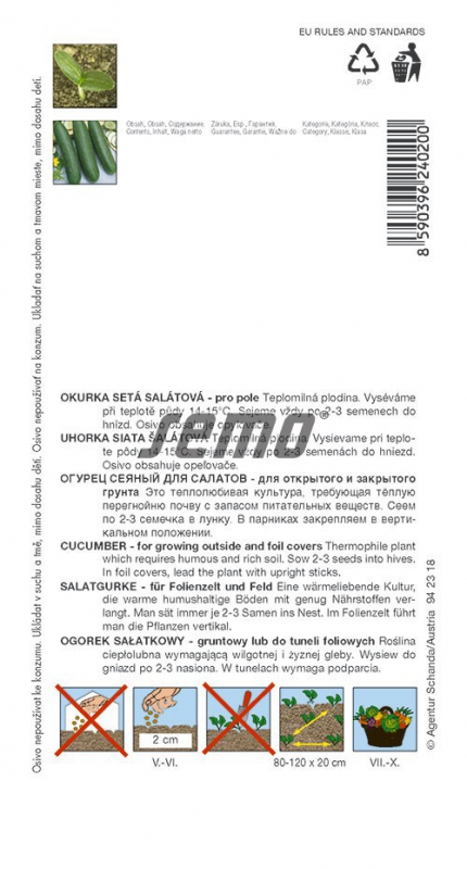 Eine sehr hochwertige, mittelspäte Hybride für den Feldanbau. Sie hat einen kräftigen Wuchs. Die Früchte sind kleiner, tief dunkelgrün, schlank, fast halslos, selten deformiert, genetisch nicht bitter. Sie hat eine ausgezeichnete Gesundheit, Wuchsstärke, ausgezeichnete Winterhärte und Regenerationsfähigkeit. Sie ist auch für eine späte Aussaat geeignet. Sie blüht nur mit weiblichen Blüten, so dass dem Saatgut Bestäuber (MIX, farblich gekennzeichnet durch Färbung) zugesetzt werden müssen. Sie ist resistent gegen CMV und Schwarze Gurke und leidet nicht unter Mehltau. Die Wachstumsperiode beträgt 83 Tage, die gesamte Kulturdauer bis zu 130-140 Tagen. Von 10 m² kann man 45 - 50 kg im Feld ernten, 140 - 150 kg im Laub.