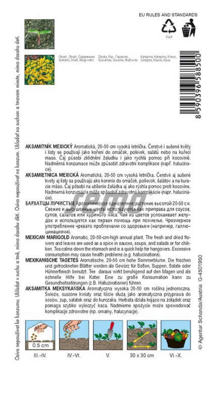 Es ist eine angenehm aromatische einjährige Pflanze von etwa 40 cm Höhe. Traditionell wird Samtblatttee zur Beruhigung des Magens, zur allgemeinen Entspannung und am nächsten Tag zur schnellen Linderung nach einer schlaflosen Nacht getrunken. Ein Aufguss der ganzen Pflanze wird bei Unterleibsschmerzen getrunken oder einem Bad bei rheumatischen Beschwerden zugesetzt. Er unterdrückt paranoide Zustände und kann auch bei der Verabreichung von stärkeren Stimulanzien verwendet werden. Nehmen Sie keinen mexikanischen Estragontee (oder andere daraus hergestellte Tränke) vor dem Autofahren ein, da er Sie zwar vor dem Fahren beruhigen kann, aber vielleicht zu stark und vielleicht dauerhaft. Sowohl Blüten als auch Blätter von nicht chemisch behandelten, selbst angebauten Pflanzen können sowohl frisch als auch getrocknet verwendet werden. Sie werden auch in Soßen, Suppen, Salaten, in Fleisch- und Gemüsegerichten verwendet. Mit diesem Gewürz gewürzte Hühner sind köstlich.