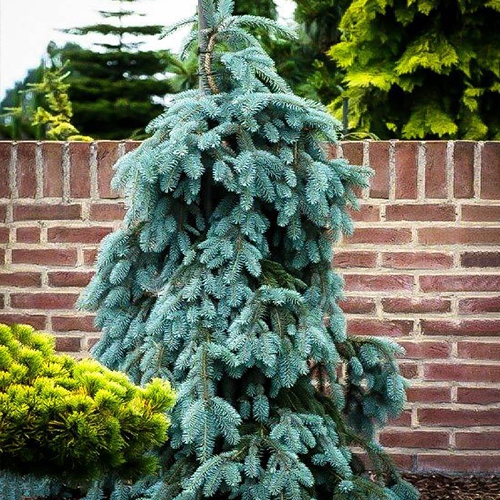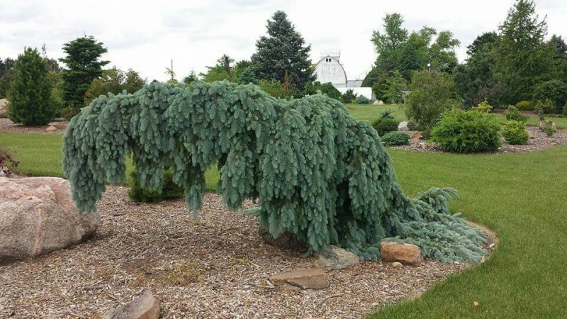 Helle, silberblaue Nadeln, die von kaskadenförmigen Ästen getragen werden, verleihen diesem Trauerbaum ein anmutiges Aussehen und eine schöne Farbe. Junge Pflanzen können frei stehen gelassen werden, um eine wilde, fast bodenbedeckende Pflanze zu schaffen.