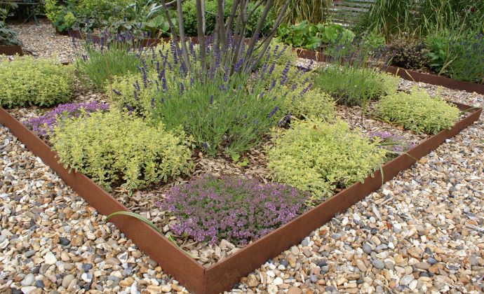 Bylinky sú osadené do záhonu s obrubou COR-TEN. Je to legovaná oceľ odolná voči atmosferickým vplyvom.