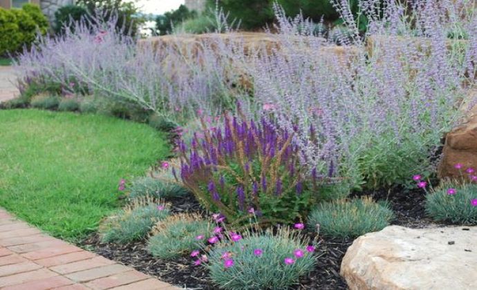 V tomto záhone sú iba tri druhy trvaliek, pričom hlavnú úlohu má odolná Perovskia. Pokiaľ sa javí ako slabá, menej rozkonárená, môžete ju na jar zostrihnúť až na 5-10 cm. Je to vynikajúca trvalka, ktorá láka do záhrady množstvo motýľov a včiel.