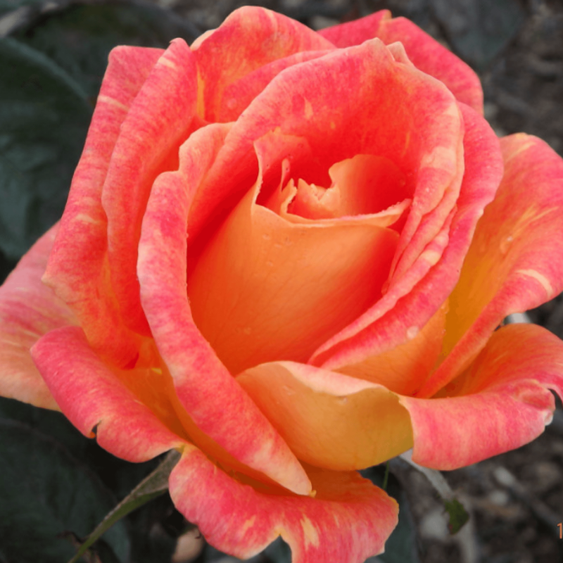 Ruža ’Harry Wheatcroft’ - nádherná plnokvetá ruža koralovo červenej farby so zlatožltou kresbou.